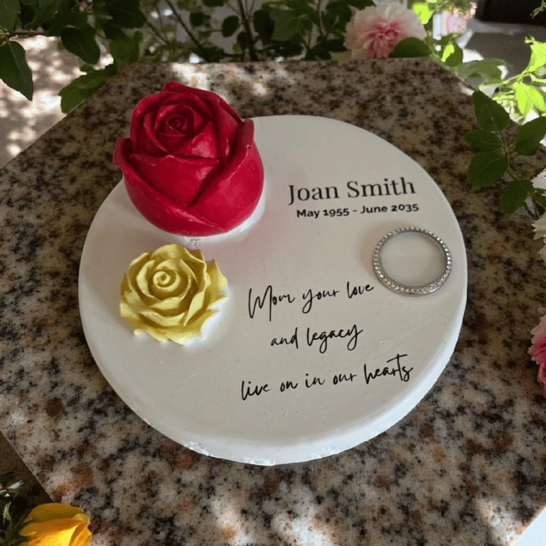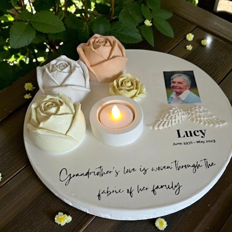 Each piece is lovingly handcrafted from concrete, with delicate concrete roses and angel wings set into the design. Whether placed at a grave site, nestled in a garden, or resting gently on your side table, these keepsakes are made to bring comfort, beauty, and a sense of peaceful remembrance.